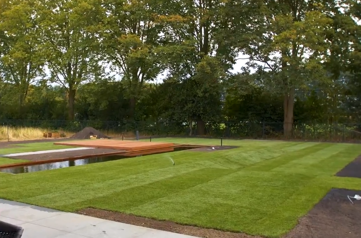 私家花园里面我们往往会做到以下几点,第1个草坪的坡度一定要有,排水决定了你这个草坪生长的好坏。第2个就是沙层,你的沙层会决定你的草坪铺的平不平整,然后我们基本上在私家花园里面会做到三公分左右的一个沙层,然后把这个地上平整以后,然后用滚筒滚过,或者是师傅拍过之后,三公分厚的砂层,然后再铺这个草,然后再把它压平。当然不可避免的是有的时候下雨,有的草坪突然下陷会有一点小坑,这个小也没有关系,如果你再讲究的话,你可以把这个再把它割开,下面再垫沙再把它拍好。最后一点就是光照跟通风,光照跟通风对于草坪的健康是很重要的,在种植前就应该考虑好。能做到这样子的话,你的光照好通风好,然后你有排水的坡度,然后你的草坪又又有这个沙层可以让它扎根,那就养起来就就OK了,我给大家分享照片。